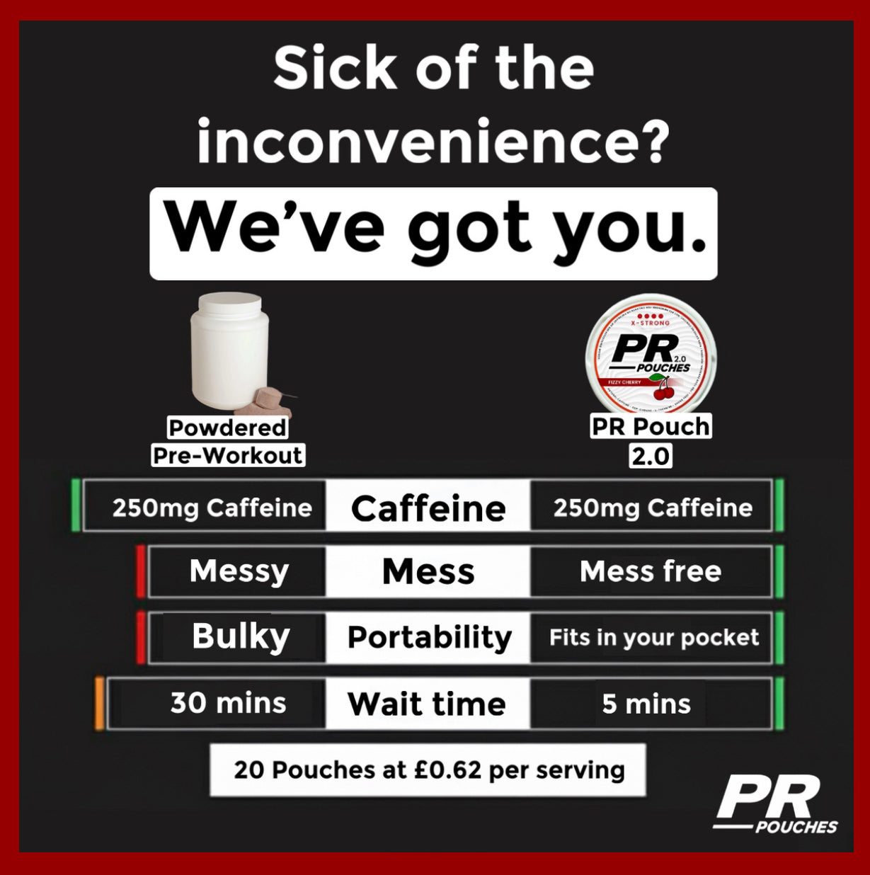 PR Pouches deliver ascience-backed pre-workout blend— 150mg Caffeine, 100mg L-Theanine, 100mg Beta-Alanine per gram — in abuccally absorbable pouch.